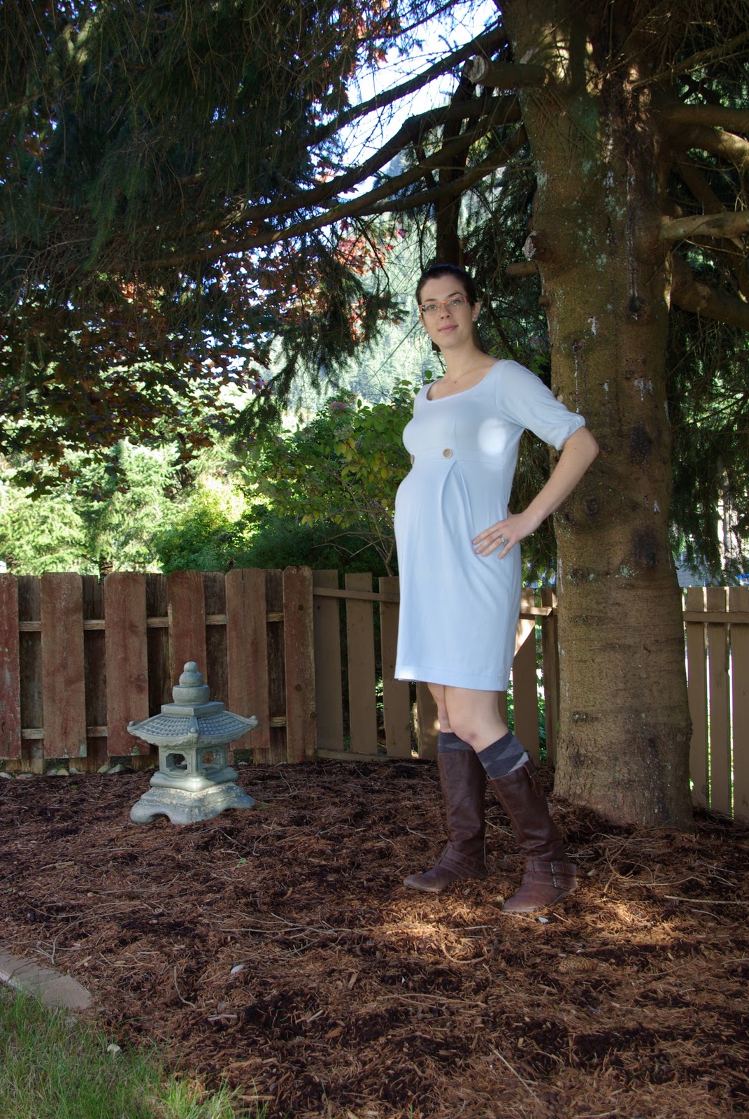 I had to repair a few loose seams, and then added elastic gathering to the sleeves to finally finish them. I also added 2 decorative buttons on the front just 'cause. I'm super happy with the way it turned out, and I can still wear it after baby comes to join us. I'm due 3 months from today!!! OMG. Craziness.